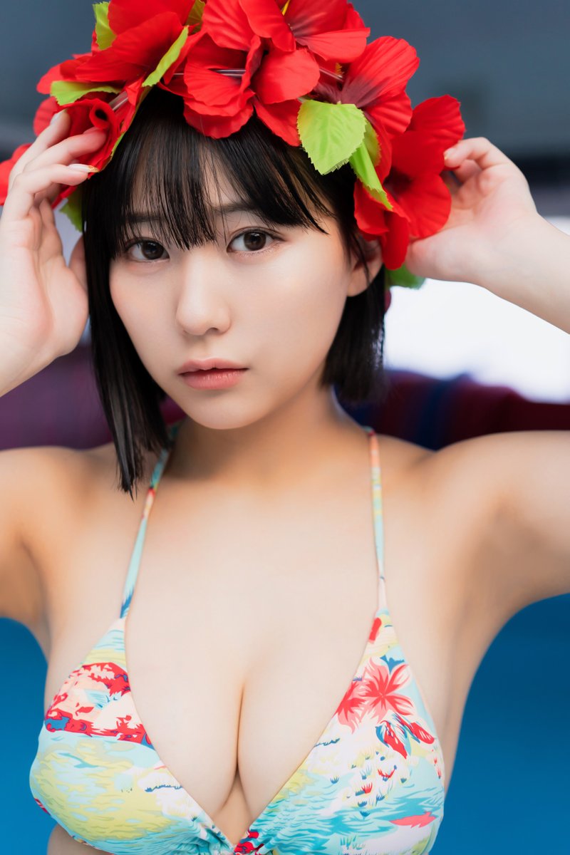 夏らしいポップな色使いのビキニをまとい、豊満な胸元をあらわにしたアップショットで「ボブのグラビアは、新鮮ですなっ」と紹介している。